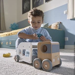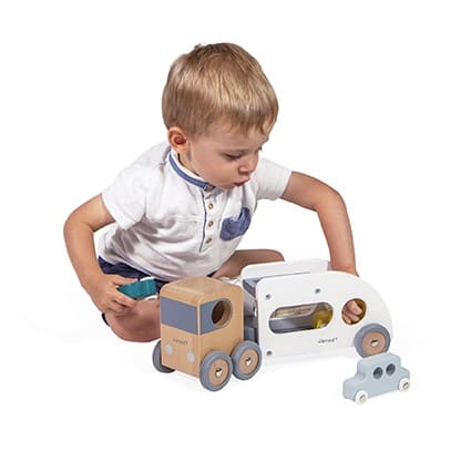 Este camión de transporte y sus tres pequeños autos azul, verde y amarillo harán las delicias de todos los fanáticos de los vehículos. El camión de transporte de automóviles está equipado con un remolque blanco extraíble, así como ruedas de goma silenciosas. ¡Pasará por cualquier sitio gracias a su extraordinario ángulo de giro!