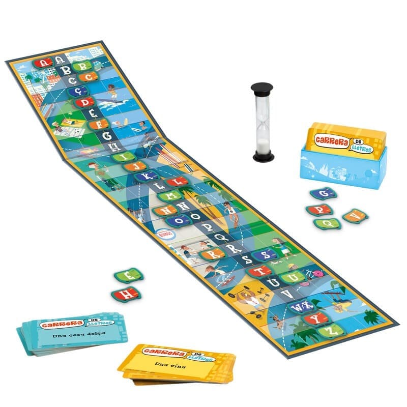 • ¿CÓMO SE JUEGA?: Se lee una tarjeta y ¡comienza la cuenta atrás! En Carrera de letras cada equipo tiene que encontrar la palabra correcta para conseguir el mayor número de letras posible. Cada vez que se usa una letra, se desplaza un hueco hacia el lado de ese equipo. ¡Gana la partida el primer equipo que logre sacar ocho letras por su lado del tablero!.