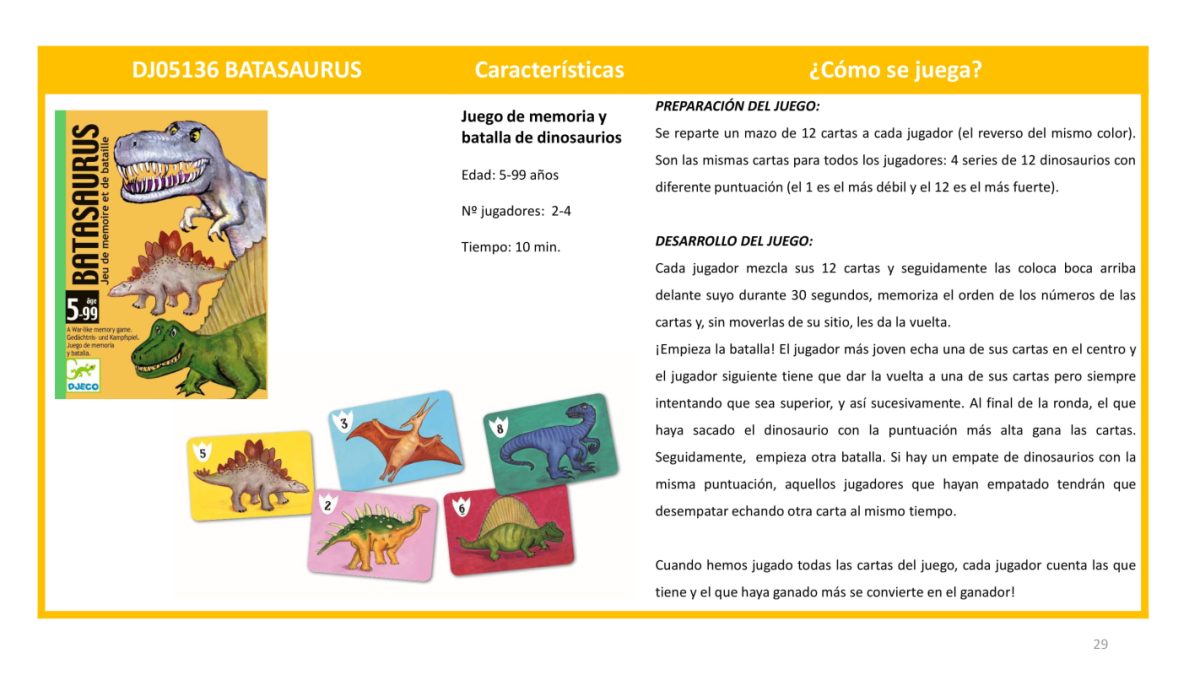 Contenido: 48 cartas (4 juegos de 12 cartas de dinosaurios para memorizar, con fuerzas numeradas del 1 al 12.) y reglas del juego en 10 idiomas.