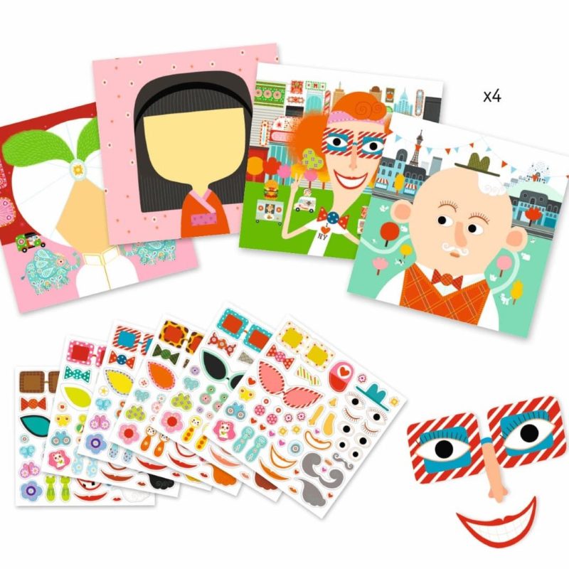 Una bolsa de collage para divertirse creando 16 caras con 400 pegatinas de colores. Una multitud de pegatinas para divertirse mostrando cómo cada uno es diferente.