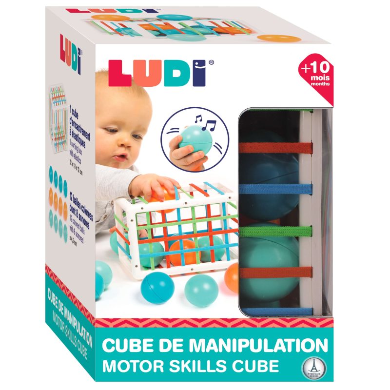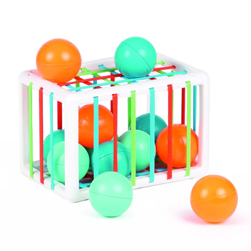 Una forma de caja de plástico con lados hechos de tiras elásticas de colores: en su interior hay 12 bolitas de colores brillantes que hacen un ruido divertido. A los más pequeños les encanta empujar las bolas dentro de la caja a través del elástico de color y luego intentar sacarlas de nuevo. Este inusual juguete de manipulación se basa en el aprendizaje a través de la experiencia.