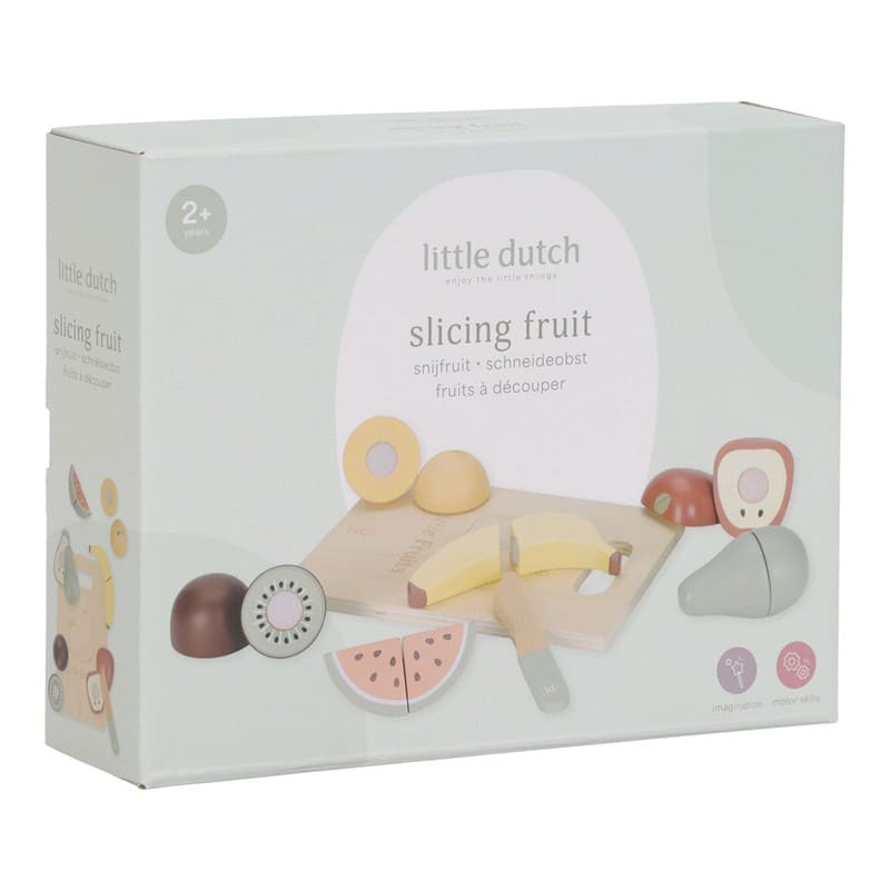 Este alegre juego de madera para cortar frutas incluye seis tipos diferentes: una manzana, una pera, un plátano, un kiwi, una naranja y una rodaja de sandía.