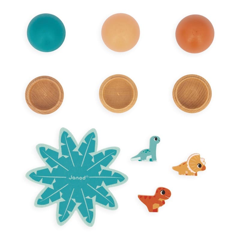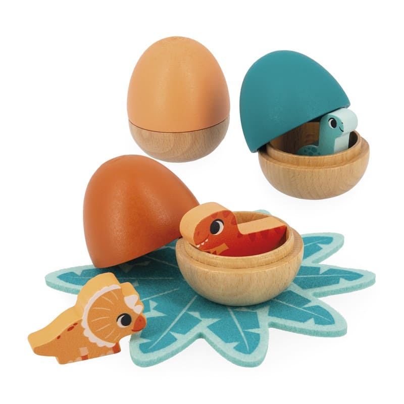 ¡Rápido! Los huevos de dinosaurio van a abrirse muy pronto y su hija o hijo podrá ayudar a los tres pequeños dinosaurios que se esconden en el interior a salir de su cómodo nido. Este juego se compone de 3 huevos de madera maciza de 3 colores diferentes, 3 dinosaurios: un diplodocus, un triceratops, un tiranosaurio Rex y una bonita flor de fieltro para depositar los huevos. El color de cada huevo corresponde al color de un dinosaurio. Una vez abiertos los huevos y encontrados todos los dinosaurios, su hijo o hija deberá encontrar el huevo correspondiente a cada dinosaurio prestando mucha atención a los colores. Este juego es ideal para descubrir formas y colores y permite a su hija o hijo desarrollar la motricidad fina.