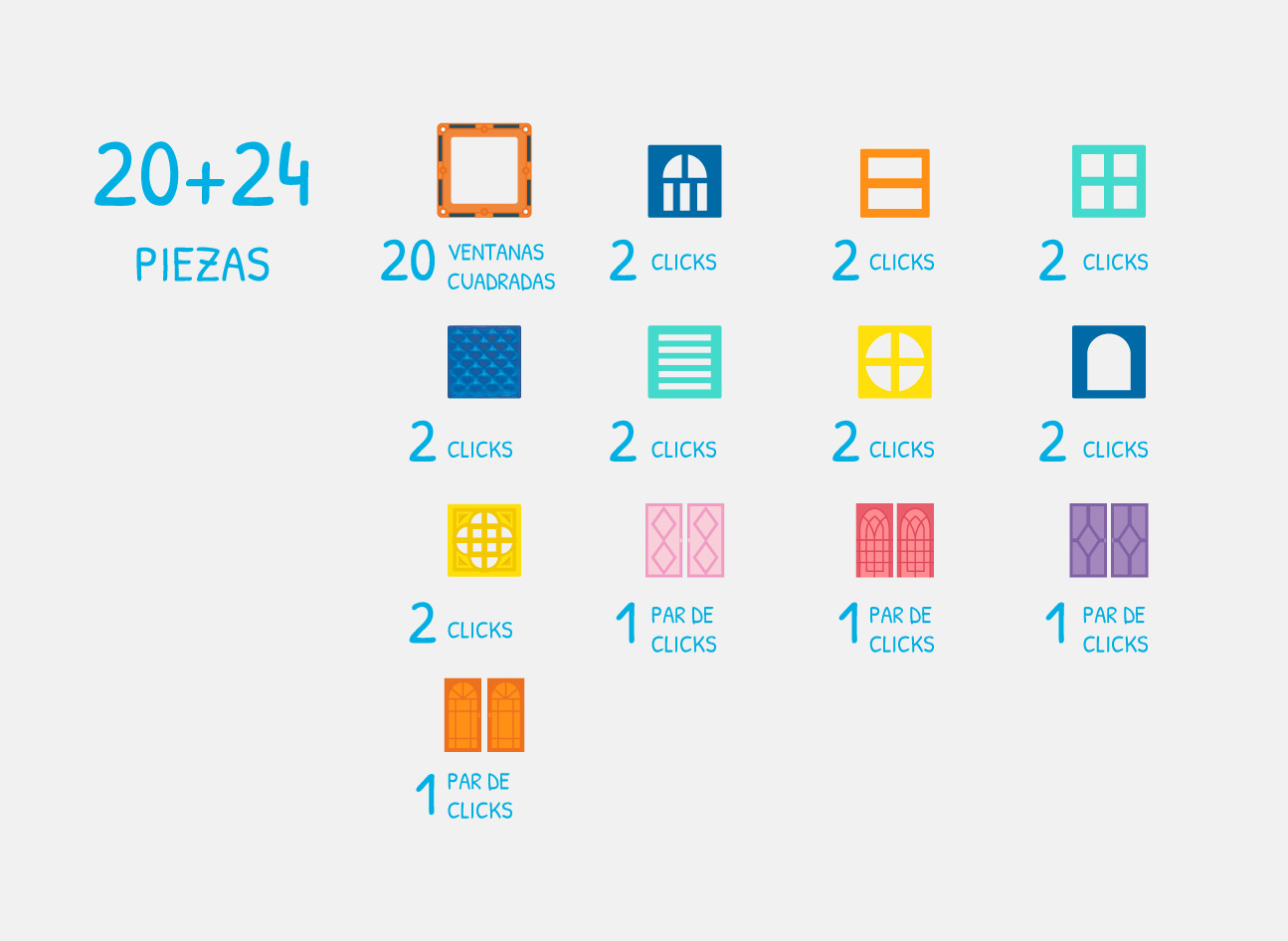 – Este pack incluye: 20 ventanas cuadradas, 16 clicks y 4 par de clicks.