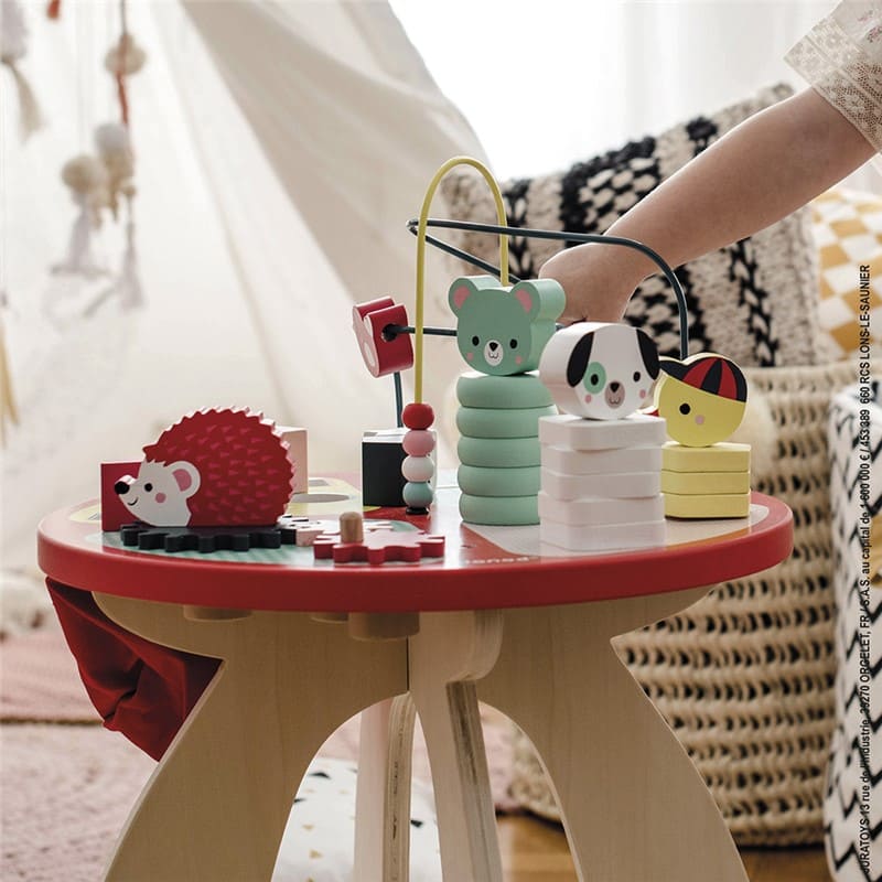 Mesa multiactividades de madera con un gran colorido, ideal para descubrir nuevos juegos a los niños. Contenido: – 3 animales apilables y un laberinto para desarrollar la habilidad del niño, – un sistema de engranaje de 4 ruedas para que el niño pueda girarlo y mejorar su coordinación, – 5 cubos de encastrar para aprender las formas y los colores, – un ábaco para desarrollar la concentración y la motricidad.
