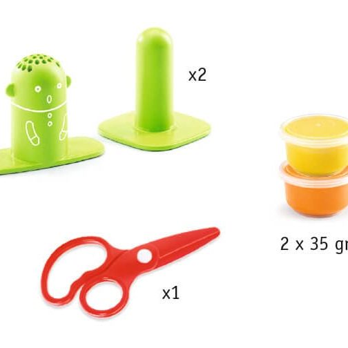 Contenido: 2 figuras de plástico, 2 botes de pasta de modelar naranja y amarilla (35g) y 1 par de tijeras.