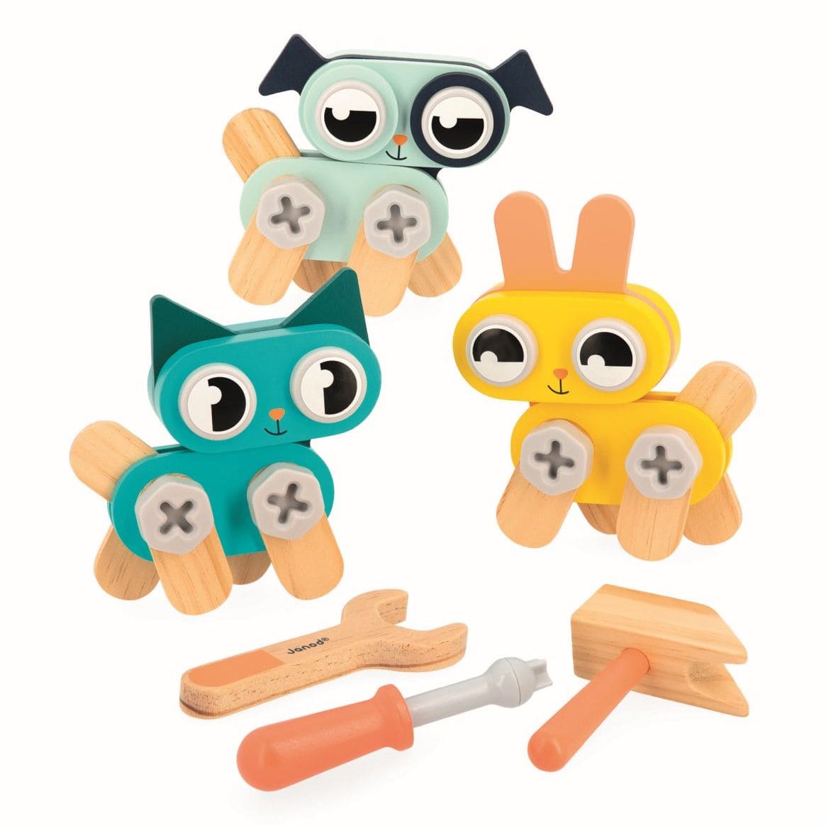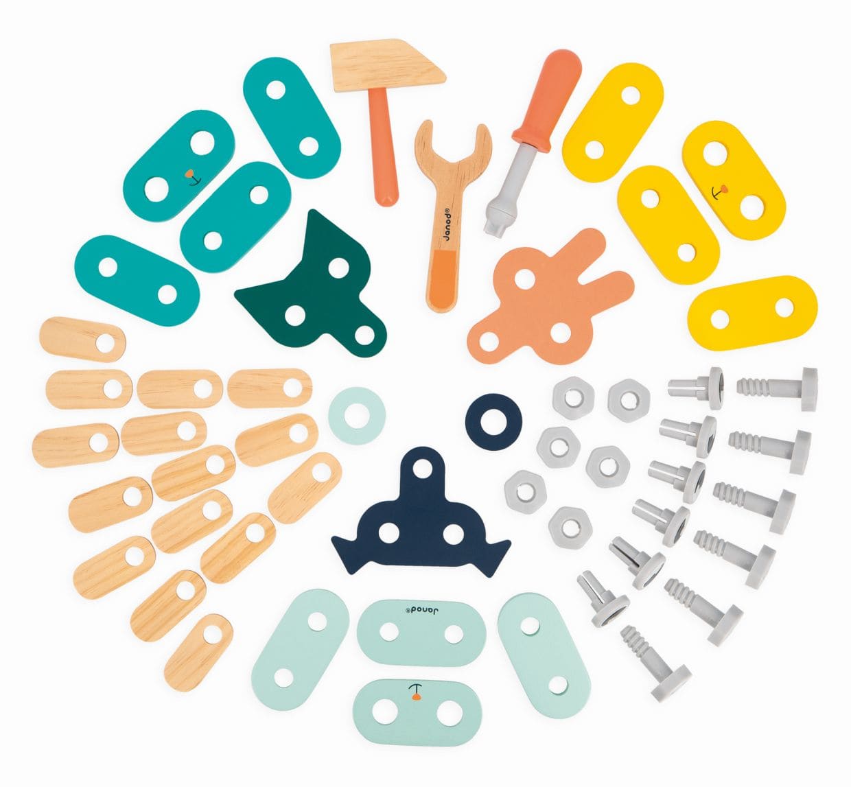 • 53 piezas y accesorios en total. 3 herramientas (destornillador, martillo y llave inglesa de madera), 32 piezas de madera y 18 elementos de plástico (tornillos, tuercas e inserciones).