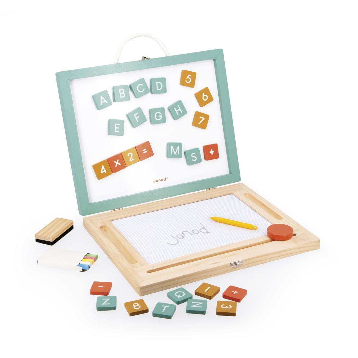 Con este maletín multiactividades, les esperan horas y horas de diversión. Este maletín contiene una pizarra mágica con su lápiz de fácil borrado, una cara magnética con imanes de letras, números y signos, una pizarra negra con tizas y un borrador y una pizarra blanca para escribir con rotulador borrable (no incluido). ¡Este práctico maletín educativo de madera se cierra fácilmente guardando en su interior todos los accesorios para que el niño se lo pueda llevar a todas partes! El asa facilita su transporte.