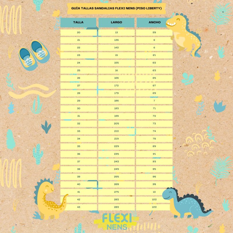 Consultar guía de tallas. Al ser una sandalia, recomendamos dejar un margen de largo de entre 0,8 cm y 1 cm máximo. (Ejemplo: si el pie del niño mide 13 cm, escogeremos la suela que mida entre 13,8 cm y 14 cm).