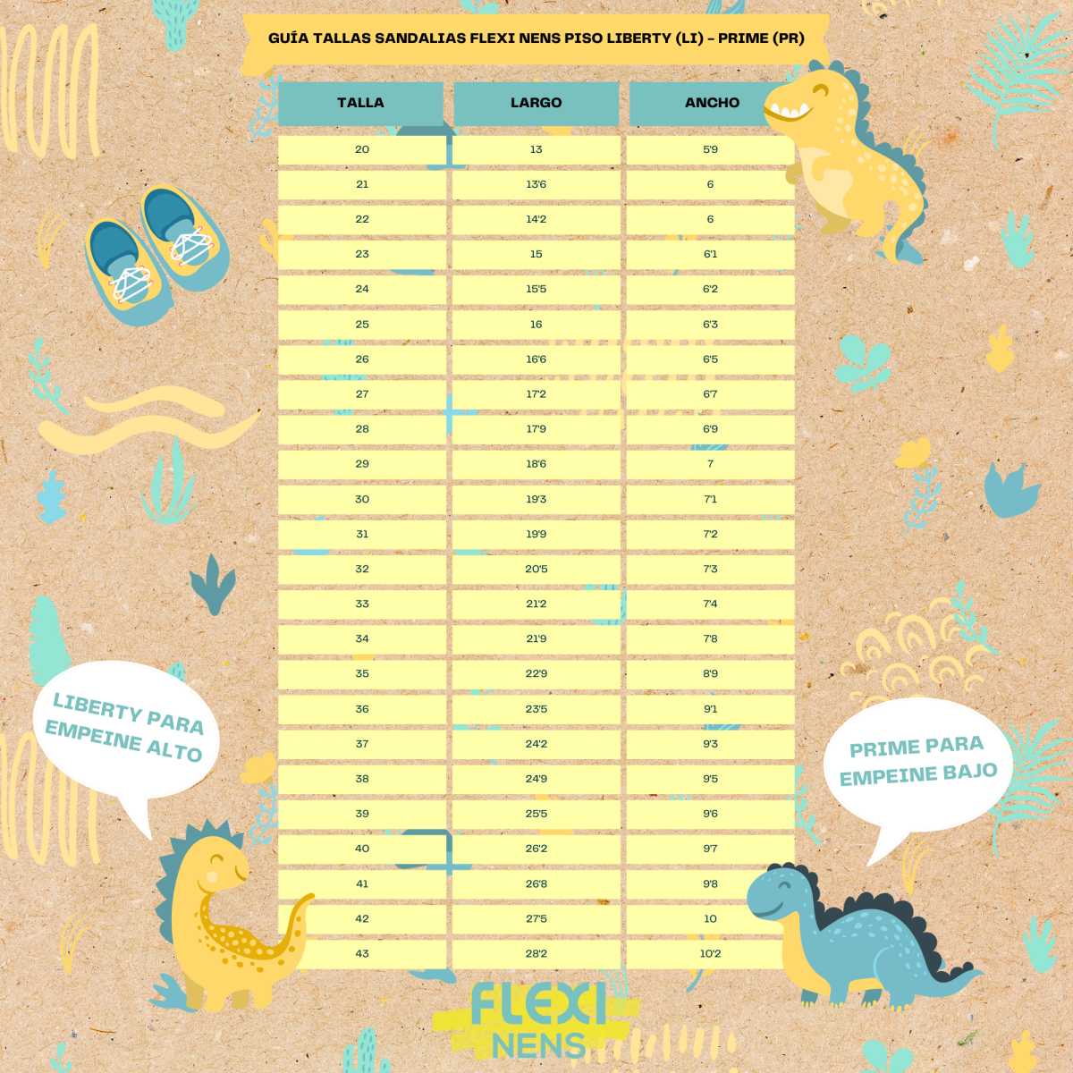 Consultar guía de tallas. Al ser una sandalia, recomendamos dejar un margen de largo de entre 0,8 cm y 1 cm máximo. (Ejemplo: si el pie del niño mide 13 cm, escogeremos la suela que mida entre 13,8 cm y 14 cm).