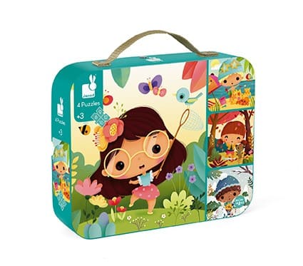 4 puzzles evolutivos de cartón de 6, 9, 12 y 16 piezas con la temática de las 4 estaciones. Se venden en una bonita caja de regalo.